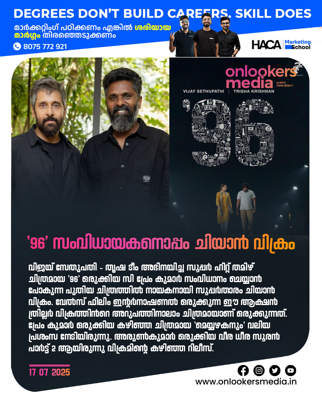 വിജയ് സേതുപതി- തൃഷ ടീം അഭിനയിച്ച സൂപ്പർ ഹിറ്റ് തമിഴ് ചിത്രമായ “96 ” ഒരുക്കിയ സി പ്രേം കുമാർ സംവിധാനം ചെയ്യാൻ പോകുന്ന പുതിയ ചിത്രത്തിൽ നായകനായി സൂപ്പർതാരം ചിയാൻ വിക്രം. വേൽസ് ഫിലിം ഇന്റർനാഷണൽ ഒരുക്കുന്ന ഈ ആക്ഷൻ ത്രില്ലർ വിക്രത്തിൻറെ അറുപത്തിനാലാം ചിത്രമായാണ് ഒരുക്കുന്നത്. പ്രേം കുമാർ ഒരുക്കിയ കഴിഞ്ഞ ചിത്രമായ “മെയ്യഴകനും” വലിയ പ്രശംസ നേടിയിരുന്നു. അരുൺകുമാർ ഒരുക്കിയ വീര ധീര സൂരൻ പാർട്ട് 2 ആയിരുന്നു വിക്രമിന്റെ കഴിഞ്ഞ റിലീസ്.